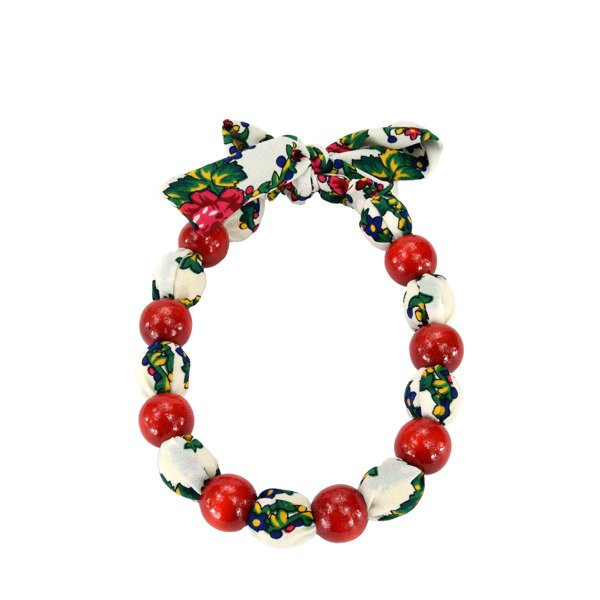 Drewniane korale obszyte materiałem pasują do każdej stylizacji. Długość całkowita korali, łącznie z tasiemką do wiązania to około 80-85 cm. Średnica korala wynosi 2 cm. Wiązaniem można regulować długość korali.
