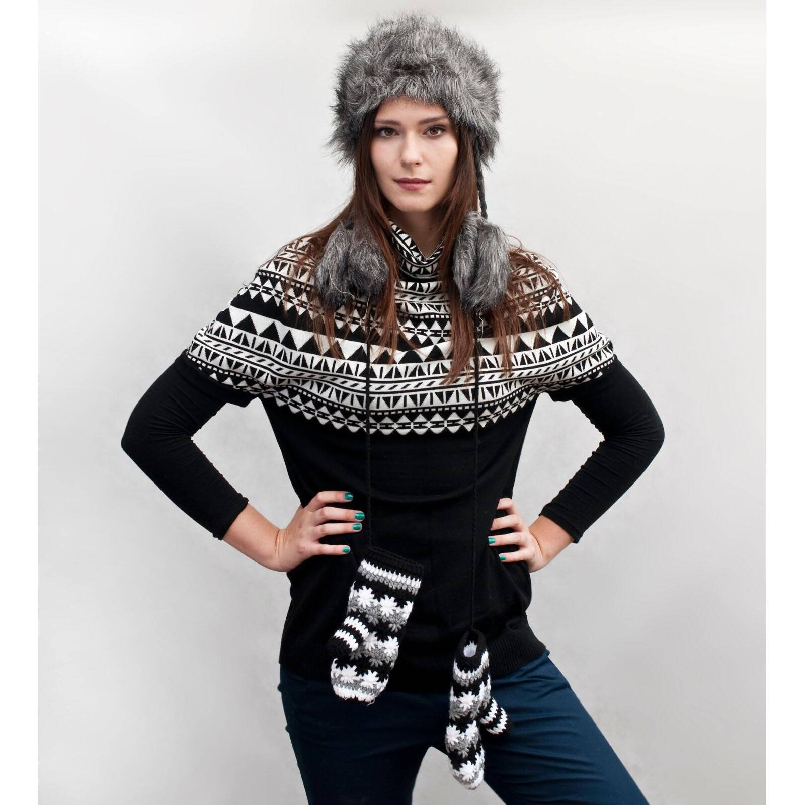 Ozdobiona pomponem oraz futrzastymi frędzlami na sznurkach.