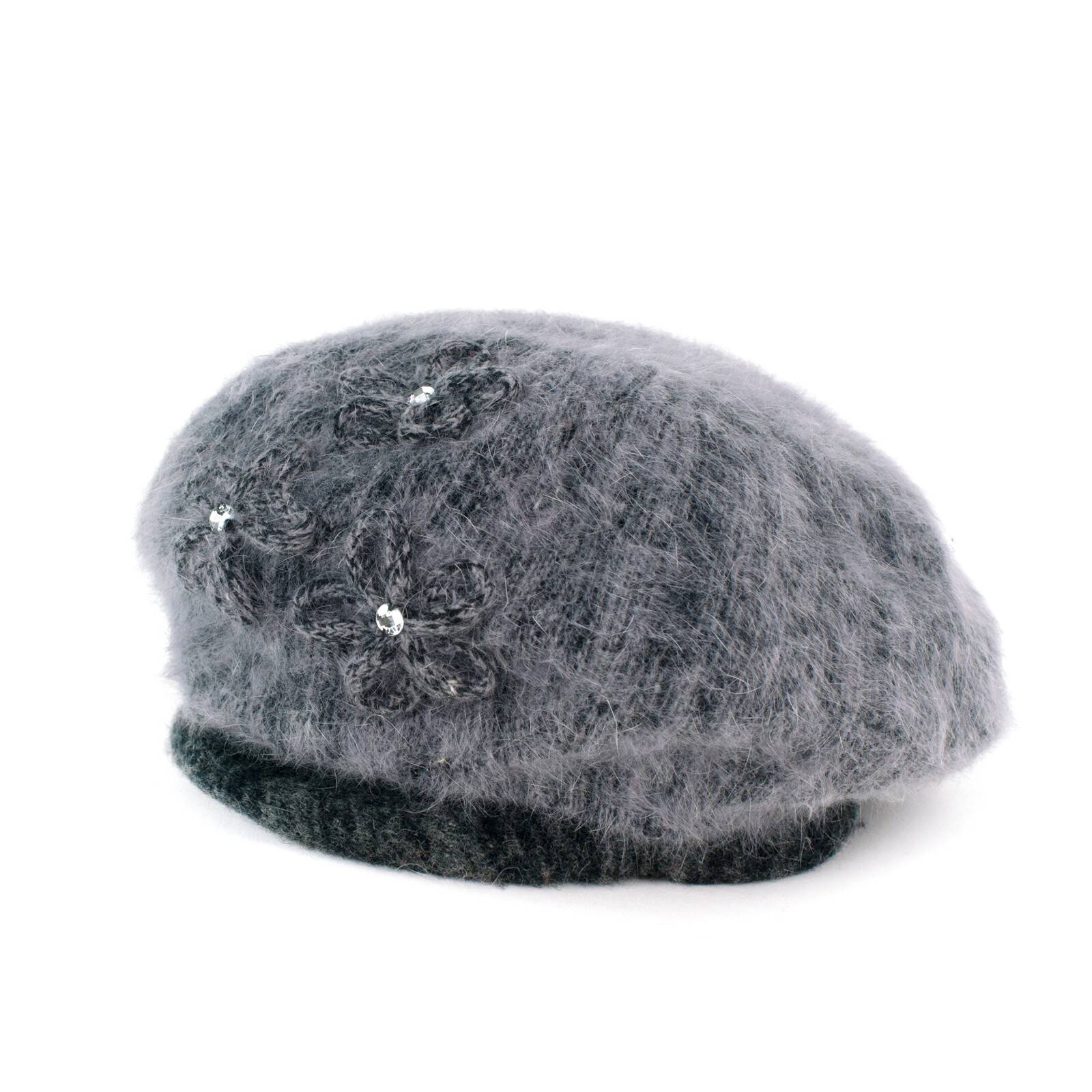 Angorowy beret ozdobiony kwiatami i kamykami.