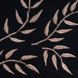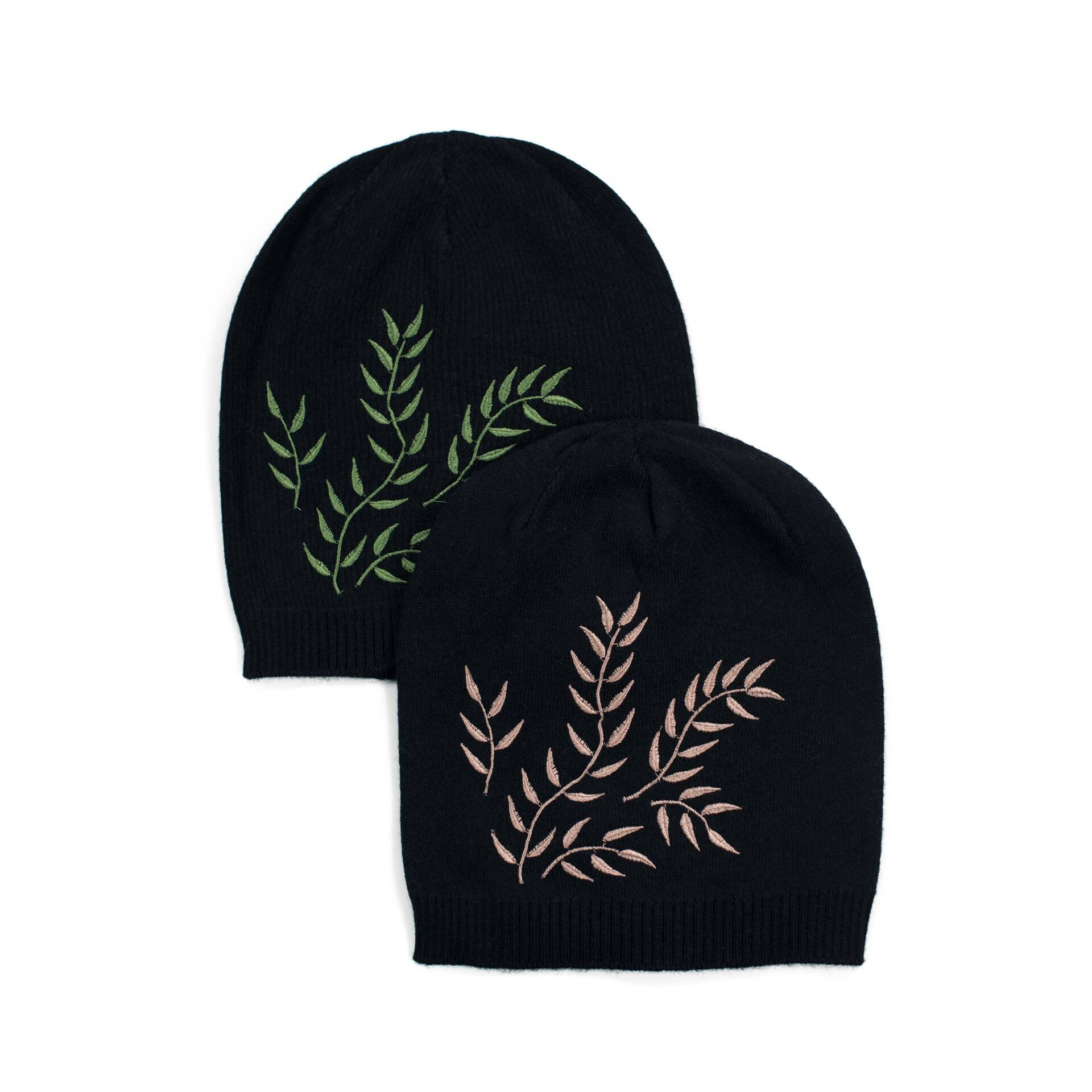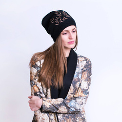 Elegancka czapka z angory, ozdobiona roślinnym haftem.