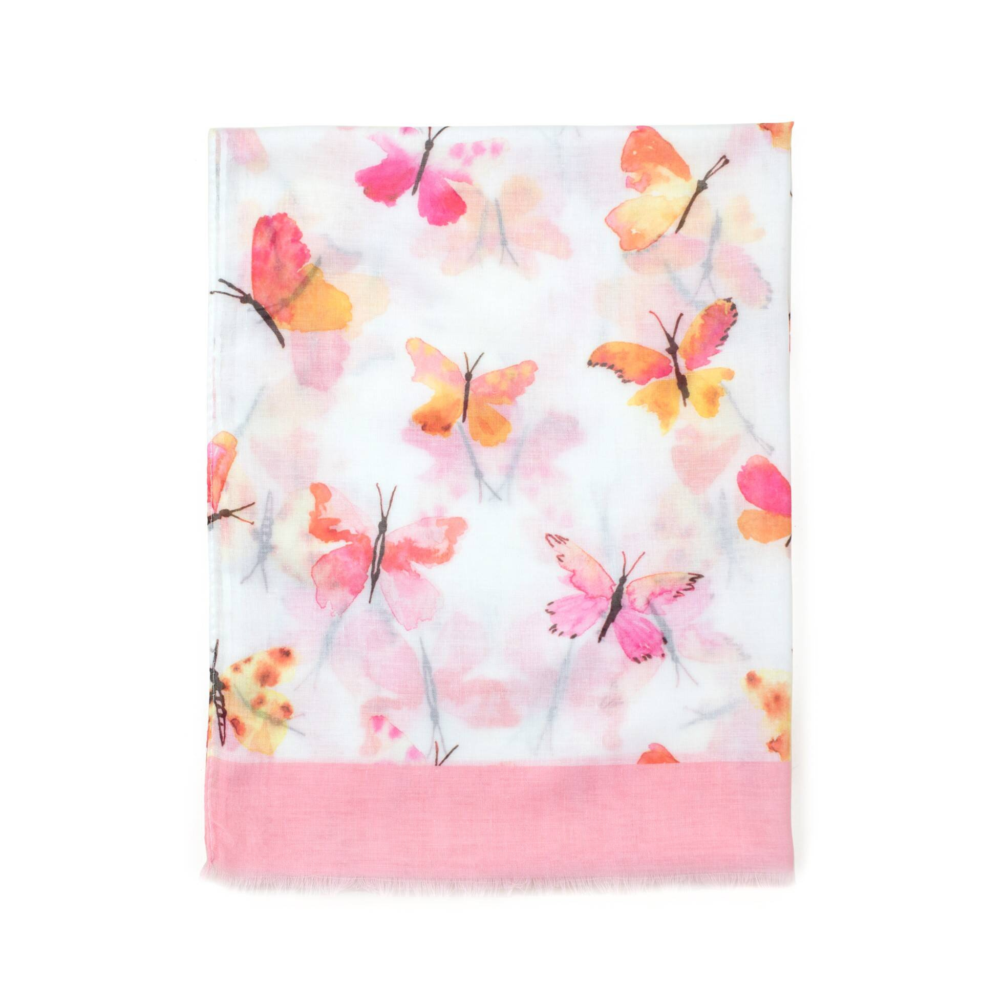 Duży szal wykonany z przyjemnej w dotyku i cienkiej wiskozy, ozdobiony printem w motylki.