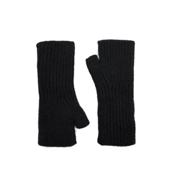 Krótkie, jednokolorowe mitenki o ściągaczowym splocie.