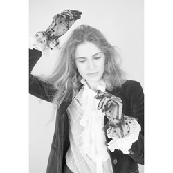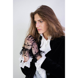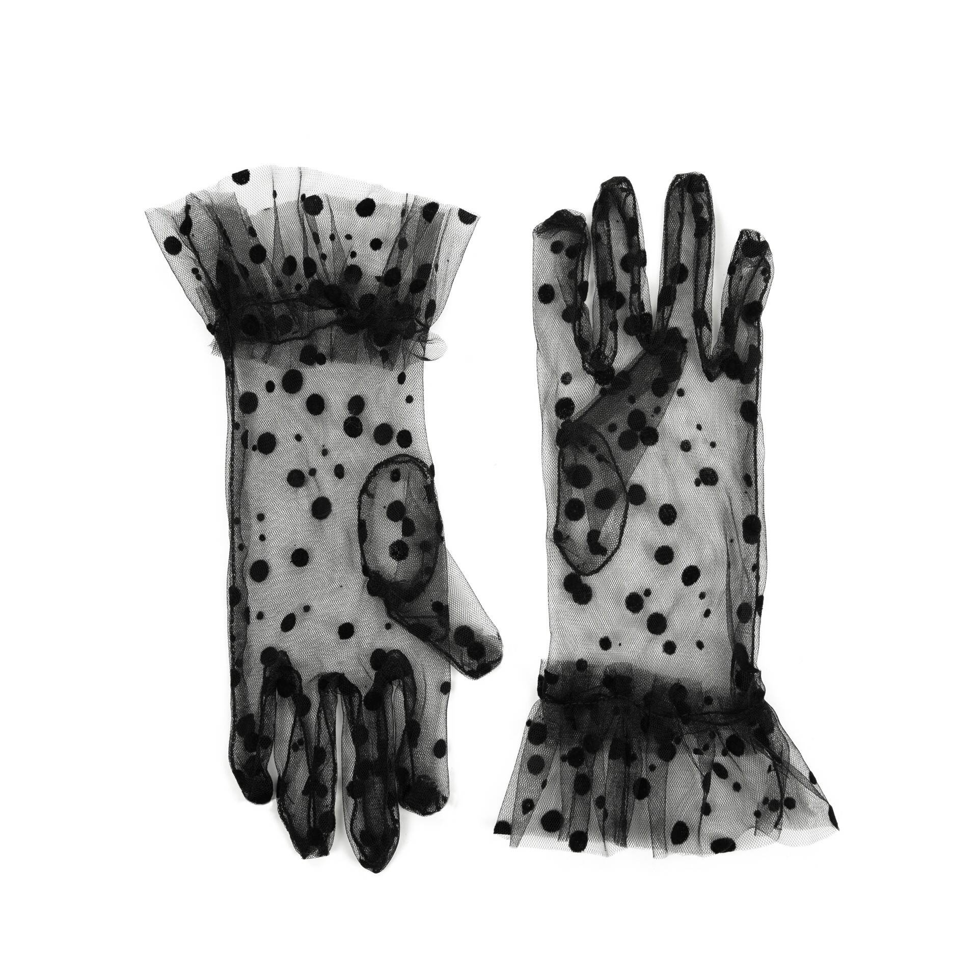 Eleganckie, delikatne, tiulowe rękawiczki w kropki.